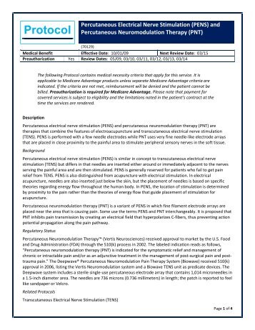 Percutaneous electrical nerve stimulation (PENS) or percutaneous neuromodulation therapy (PNT) is unproven and/or not medically necessary for treating pain. There is limited evidence in the peer reviewed literature to support that PENS or PNT will improve health outcomes in ... View Doc